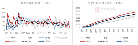 2025/26年度加拿大菜籽出口量预计700万吨(同比下滑7%)。截至10月17日,2025/26年度加拿大仅出口菜籽109.5万吨(去年同期为259.9万吨,历史五年同期均值是189.1万吨)。