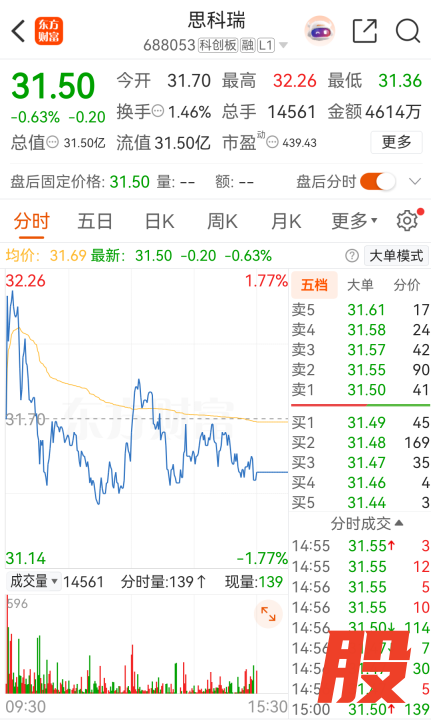 截至9月19日收盘,思科瑞股价为31.50元/股,总市值为31.50亿元。